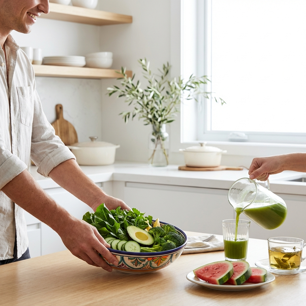 Beber suficiente es fundamentalmente importante para tu salud. El agua sin gas debe ser tu bebida principal, aproximadamente 1,5 a 2 litros diarios, según el nivel de actividad y la temperatura exterior. Las infusiones de hierbas de ortiga, diente de león o jengibre también son buenas opciones. Un vaso de agua tibia con zumo de limón fresco por la mañana puede ser un ritual agradable.