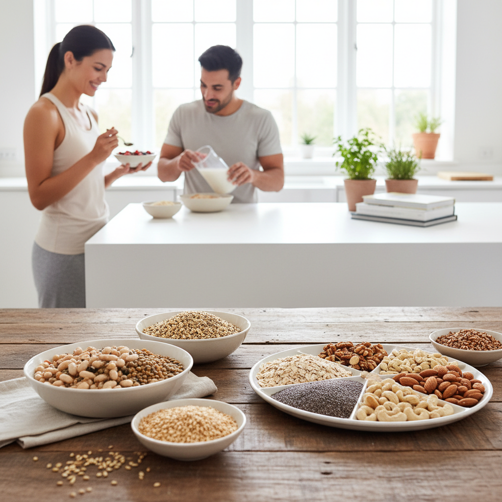 Hülsenfrüchte sind hervorragende Protein-, Ballaststoff- und Mineralstoffquellen. Zahlreiche Studien zeigen, dass Menschen, die regelmäßig Hülsenfrüchte konsumieren, ein geringeres Risiko für Herzerkrankungen, Typ-2-Diabetes und bestimmte Krebsarten haben. Vollkorngetreide liefert wichtige B-Vitamine, Ballaststoffe und Mineralstoffe. Nüsse sind reich an gesunden Fetten, Proteinen und Antioxidantien.